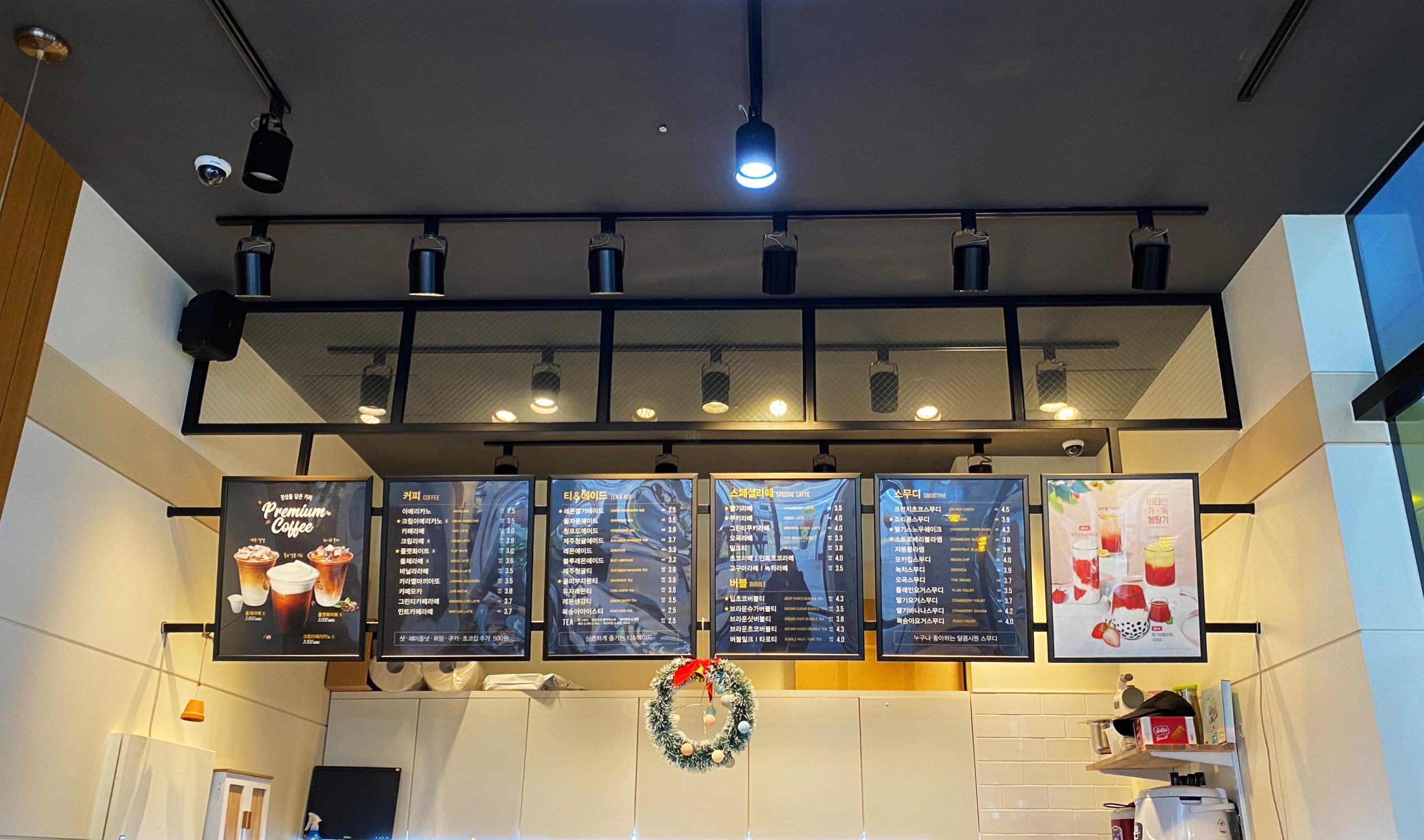 To overcome these limitations, a new solution called an open metal frame was introduced, completely breaking away from the existing heavy shelf structure to create a light and transparent feel. In particular, the thin and stylish frame line and the angle of the menu board that falls in line with the view secured the visual depth of the space while maximizing the readability of the menu board.