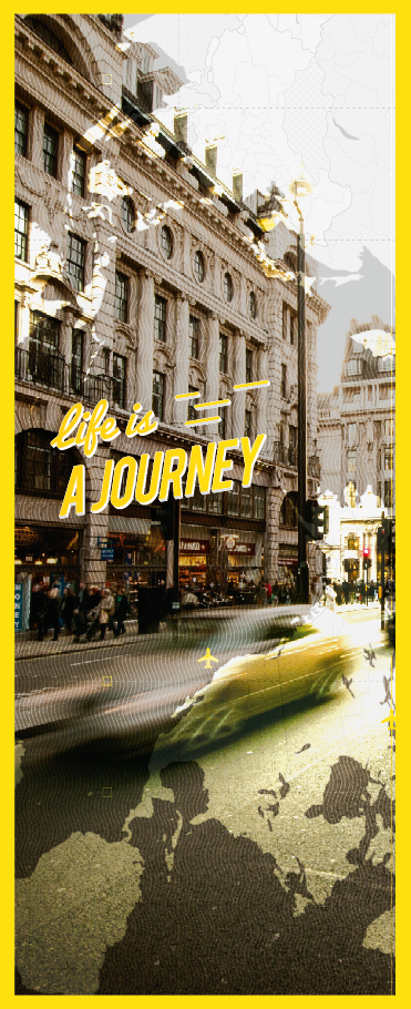 Using maps with adjusted transparency as a background for exotic photos, the images of travel and exploration are depicted to visually express the conceptual orientation of space.