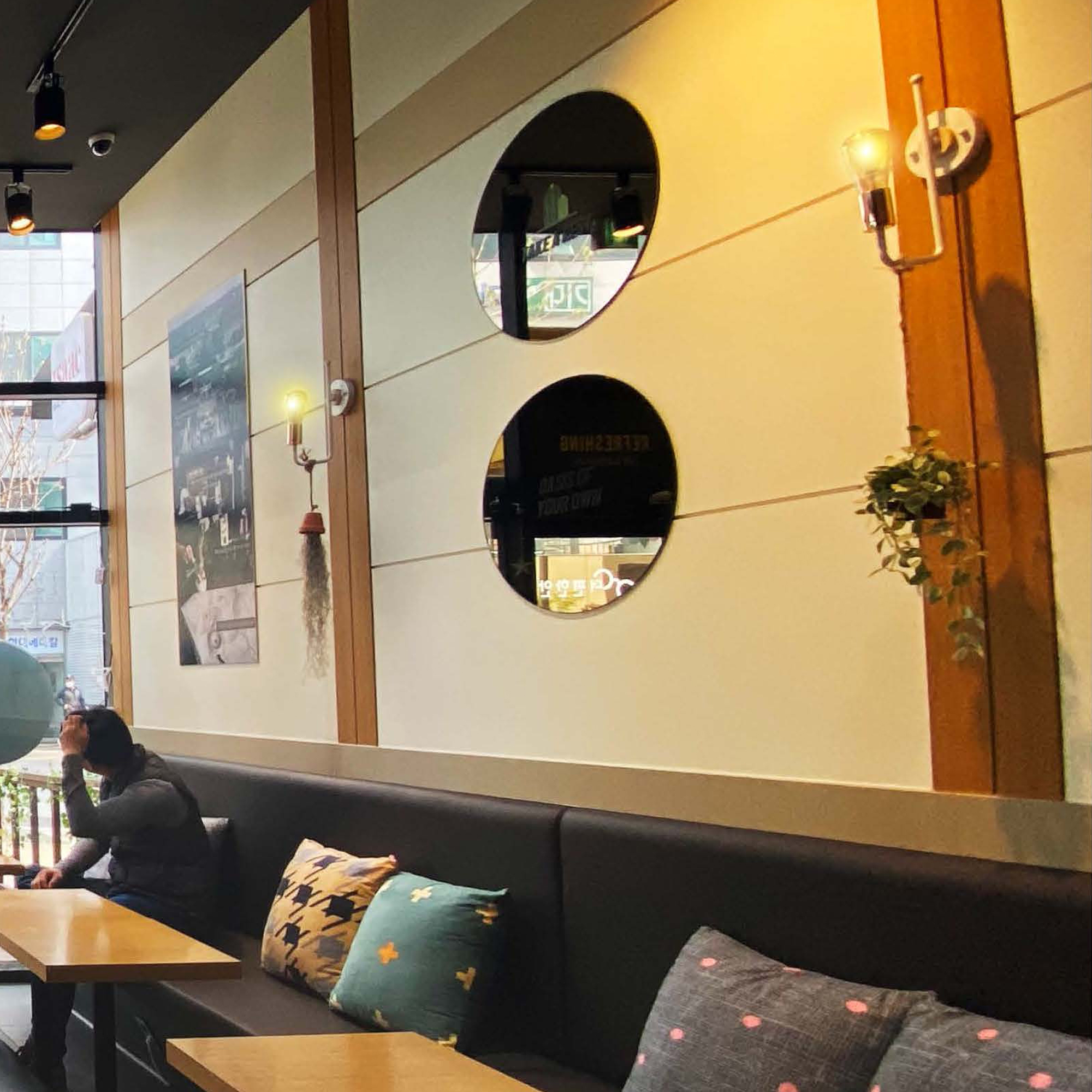 The core of this design is ‘openness’. The original high ceiling was utilized, and lightweight steel frames were used as structures, such as ceiling rail lighting and menu boards instead of the existing stuffy structure, to complement the limitations of structures that could create a stuffy feeling inside the store. In addition, by adopting transparent lighting and using round mirrors, elements that could block the view were limited, allowing customers to feel an open view and visual ventilation.